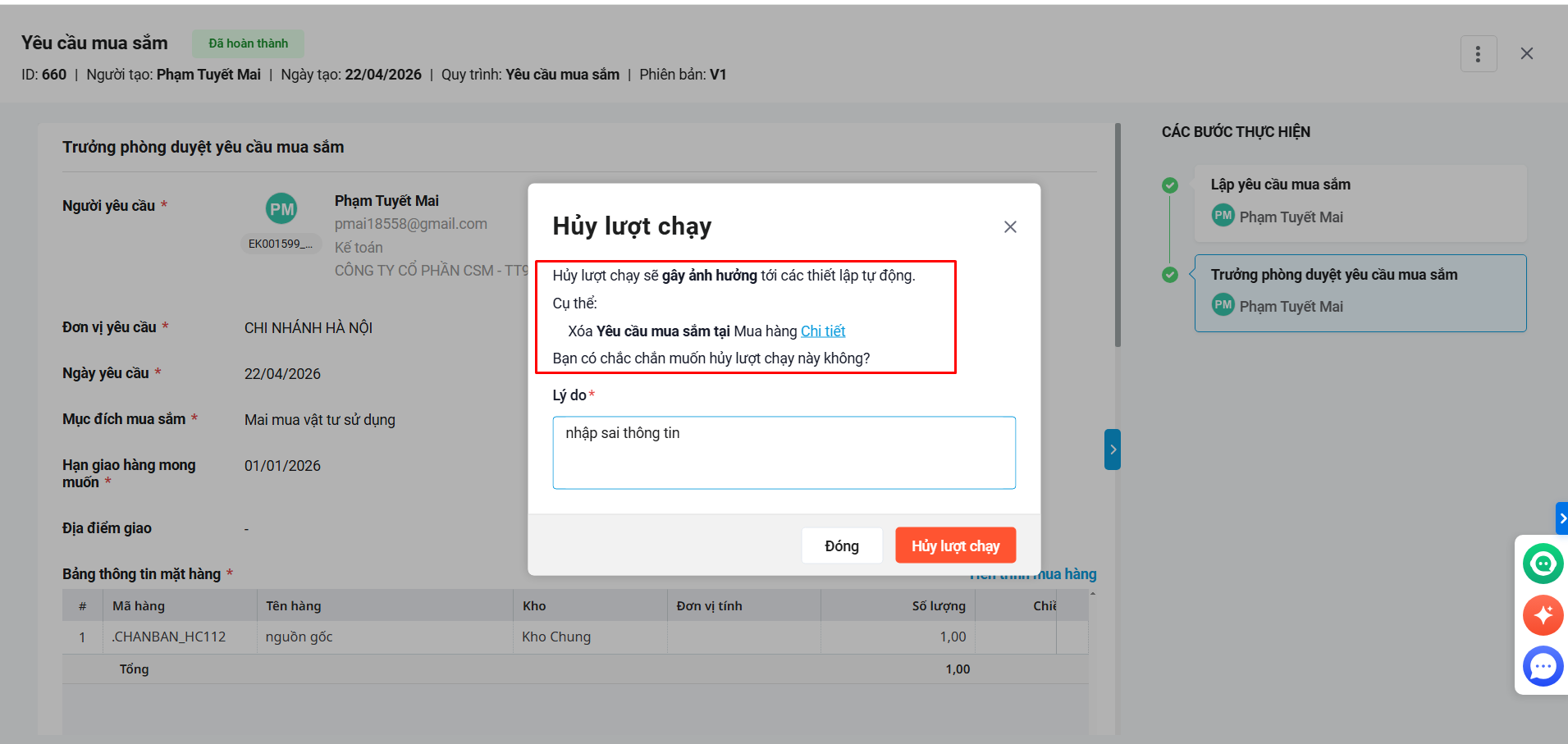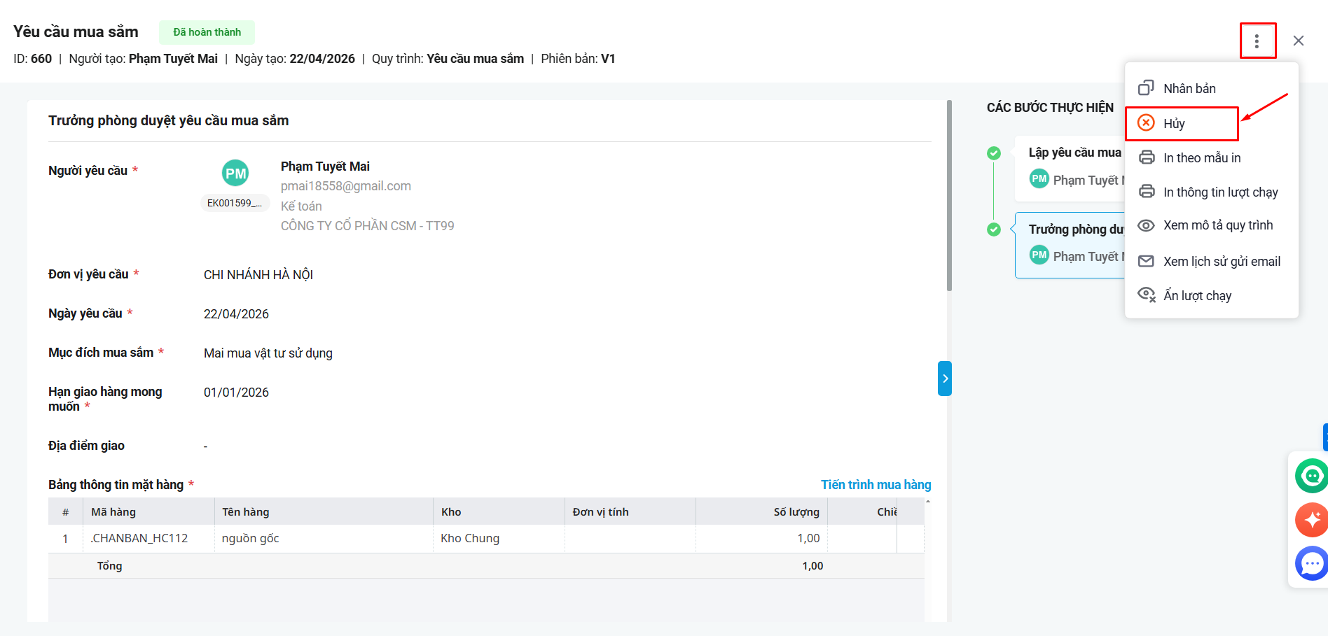 - Trường hợp quy trình được duyệt bên AMIS Quy trình sau đó đồng bộ yêu cầu mua sắm sang AMIS Mua hàng nhưng thấy sai muốn hủy chạy lại thì sang AMIS Quy trình nhấn Hủy/ Bên AMIS Mua hàng sẽ thực hiện xóa Yêu cầu mua sắm đó khỏi phần mềm.