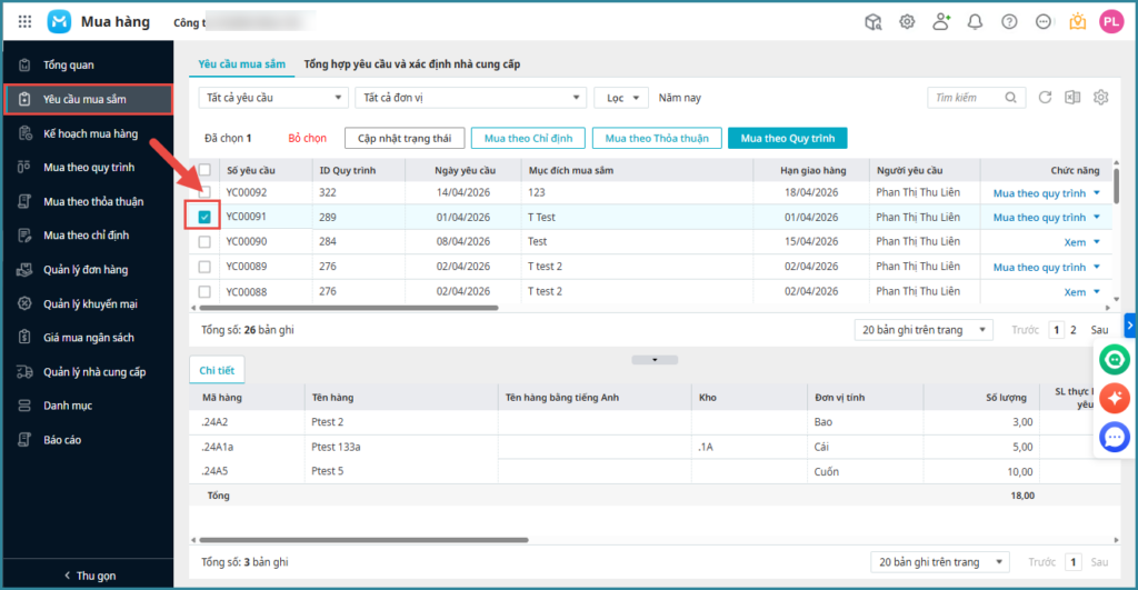 Bước 1: Vào phân hệ Yêu cầu mua sắm\ Tích chọn Yêu cầu mua sắm muốn cập nhật trạng thái.