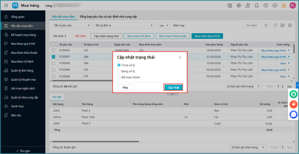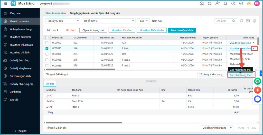 Bước 2: Trên dòng yêu cầu mua sắm đã chọn\ Xổ mũi tên chọn Cập nhật trạng thái.