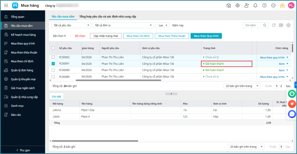 Bài viết hướng dẫn cách điều chỉnh/cập nhật trạng thái Yêu cầu mua sắm (YCMS) khi có sự thay đổi về nhu cầu thực tế của khách hàng (thay đổi số lượng hoặc hủy mặt hàng) trong quá trình đặt hàng, nhằm đảm bảo dữ liệu giữa các chứng từ luôn khớp đúng và phản ánh chính xác thực trạng mua hàng.