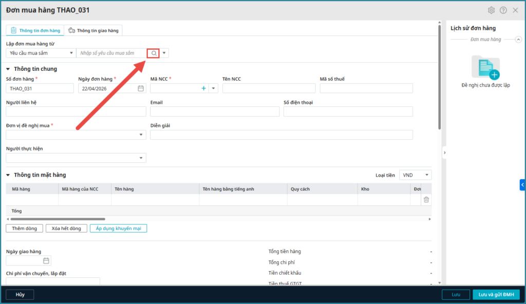 Bước 1: Trên giao diện lập đơn mua hàng\ Nhấn vào biểu tượng kính lúp để tìm kiếm và chọn yêu cầu mua sắm: