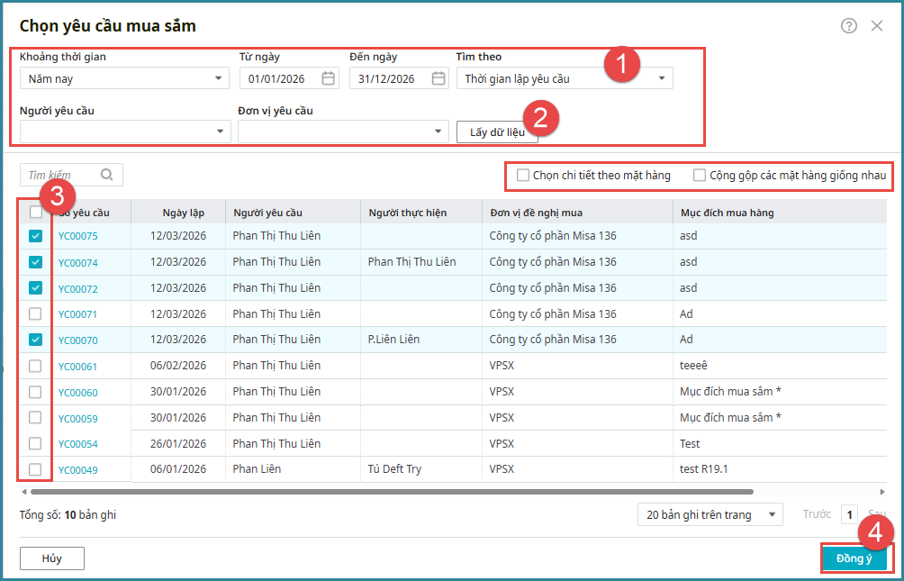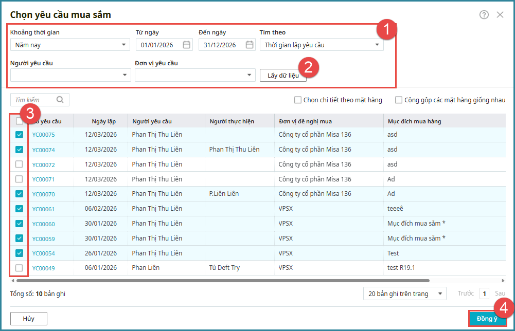 Bước 2: Thiết lập điều kiện để tìm kiếm yêu cầu mua sắm: