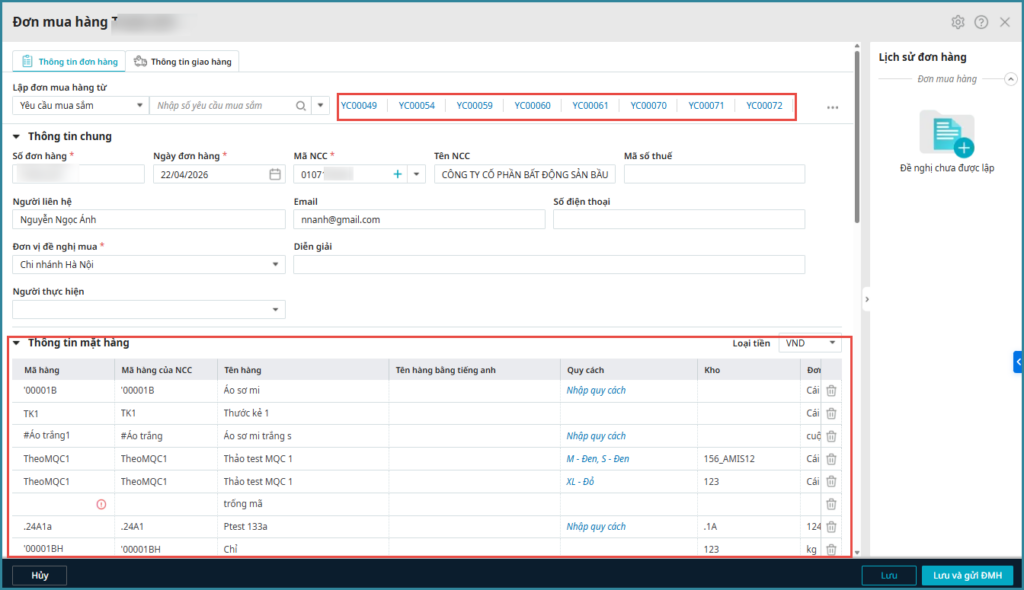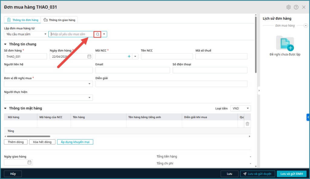 Bước 3: Kiểm tra và khai báo bổ sung các thông tin còn thiếu cho đề nghị mua hàng. Nhấn Lưu và gửi duyệt để hoàn tất.