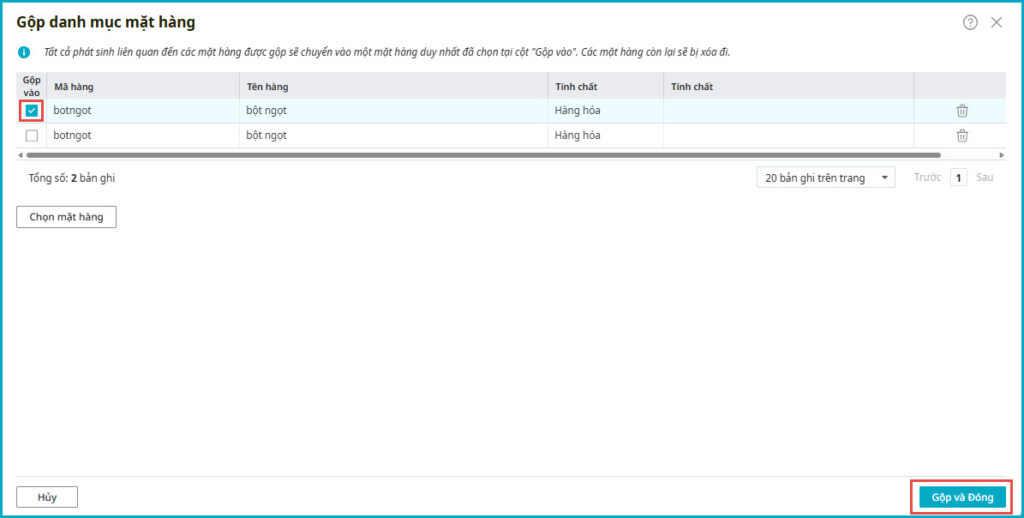 • Lưu ý: Tất cả phát sinh liên quan đến các mặt hàng được gộp sẽ chuyển vào một mặt hàng duy nhất đã chọn tại cột Gộp vào. Các mặt hàng khác sẽ bị xóa đi.