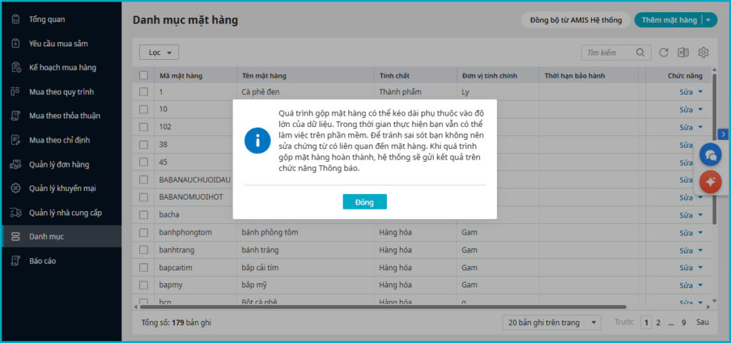Chức năng gộp mặt hàng được thiết kế nhằm hỗ trợ các doanh nghiệp quản lý hiệu quả danh mục mặt hàng của mình. Tính năng này cho phép người dùng dễ dàng phát hiện và xử lý các mặt hàng bị trùng lặp trong hệ thống, từ đó hợp nhất các thông tin liên quan về một mặt hàng duy nhất. Việc gộp mặt hàng không chỉ giúp giảm thiểu sai sót, tránh dư thừa dữ liệu mà còn nâng cao hiệu quả quản lý kho, bán hàng và báo cáo. Nhờ đó, doanh nghiệp có thể tiết kiệm thời gian, tối ưu quy trình vận hành và đảm bảo dữ liệu luôn chính xác, nhất quán.