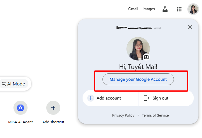 Bước 2: Nhấn vào avatar Google\ Chọn Quản lý tài khoản Google.