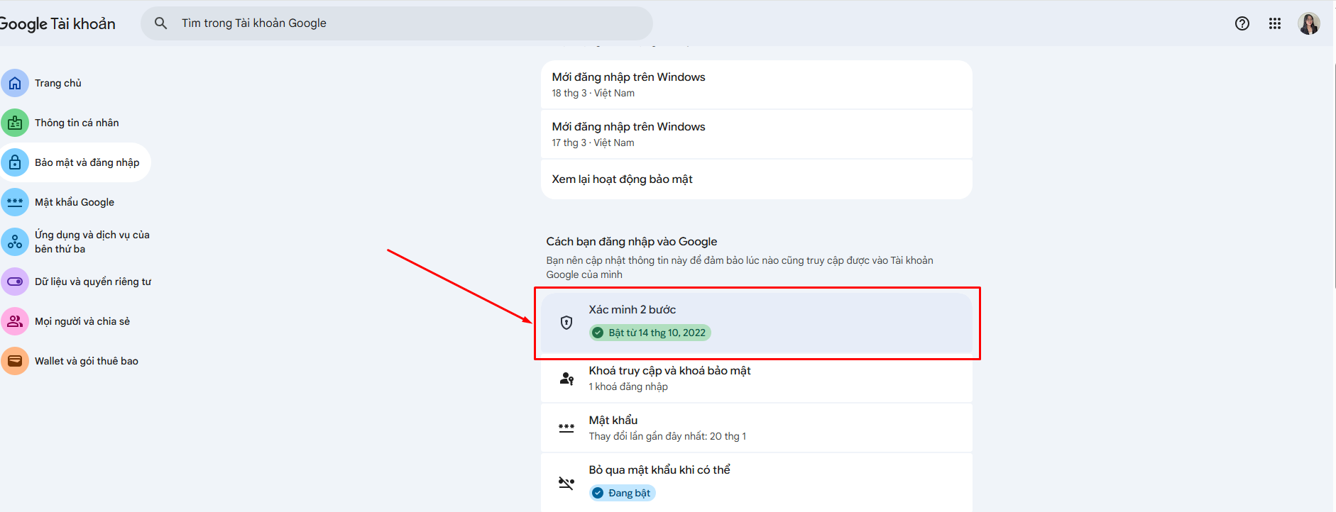 Bước 4: Chọn Xác minh 2 bước\ Kích hoạt xác minh 2 bước.