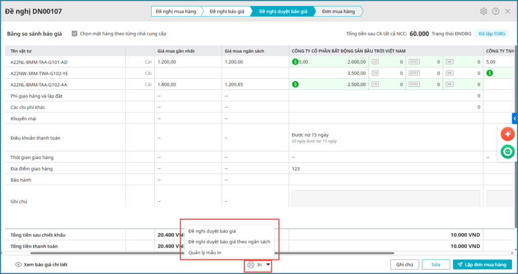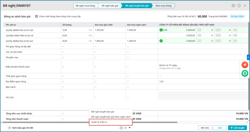 - Trên Đề nghị duyệt báo giá → chọn chức năng In.