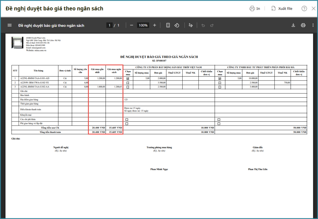 - Phần mềm cho phép In theo Đề nghị duyệt báo giá, Đề nghị duyệt báo giá theo ngân sách và thể hiện thông tin so sánh ngay trên bản in.