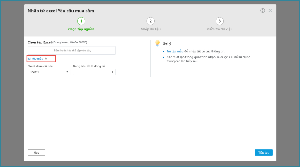 Bước 2: Chọn tệp nguồn: Chọn file excel chứa dữ liệu cần nhập khẩu.