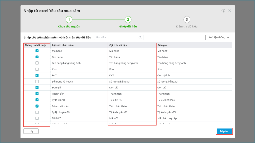 Lưu ý: Chương trình đáp ứng tiện ích Nhập từ Excel trên giao diện chi tiết của các chứng từ sau: Thỏa thuận mua hàng; Đề nghị duyệt báo giá; Kế hoạch mua hàng. Ví dụ 1: Nhập khẩu từ excel trên giao diện lập Đề nghị duyệt báo giá (Các chứng từ khác thực hiện thao tác tương tự). Bước 1: Trên giao diện Lập đề nghị duyệt báo giá\ Chọn chức năng Nhập từ excel. Bước 2: Chọn tệp nguồn: Chọn file excel chứa dữ liệu cần nhập khẩu. Bước 3: Ghép dữ liệu: Ghép cột dữ liệu trên phần mềm với cột dữ liệu trong file excel. Lưu ý: Trường hợp mong muốn lấy thêm hoặc bỏ bớt các thông tin trên các mã danh mục cần nhập khẩu thì có thể tích Ẩn/hiện thông tin. Bước 4: Kiểm tra dữ liệu: Chương trình hiển thị các dữ liệu không hợp lệ (nếu có) để kiểm tra lại. Bước 5: Nhấn Nhập dữ liệu: Chương trình hiển thị kết quả nhập khẩu Ví dụ 2: Nhập khẩu Yêu cầu mua sắm. Bước 1: Trên giao diện Lập yêu cầu mua sắm\ Chọn chức năng Nhập từ excel. Bước 2: Chọn tệp nguồn: Chọn file excel chứa dữ liệu cần nhập khẩu. Bước 3: Ghép dữ liệu: Ghép cột dữ liệu trên phần mềm với cột dữ liệu trong file excel. Bước 4: Kiểm tra dữ liệu: Chương trình hiển thị các dữ liệu không hợp lệ (nếu có) để kiểm tra lại. Bước 5: Nhấn Nhập dữ liệu: Chương trình hiển thị kết quả nhập khẩu.Nhập khẩu chứng từ