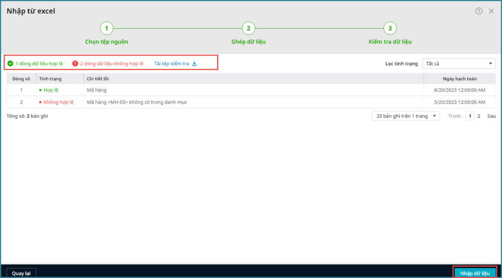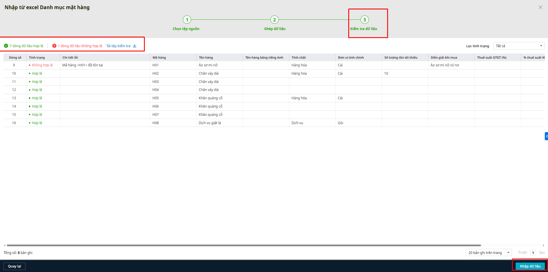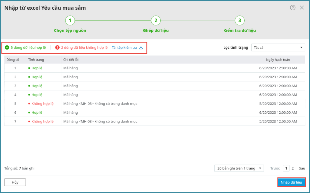 Bước 4: Kiểm tra dữ liệu: Chương trình hiển thị các dữ liệu không hợp lệ (nếu có) để kiểm tra lại.