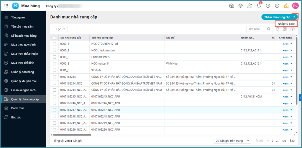 Ví dụ 2: Nhập khẩu danh mục nhà cung cấp (Ccá danh mục khác thực hiện thao tác tương tự).