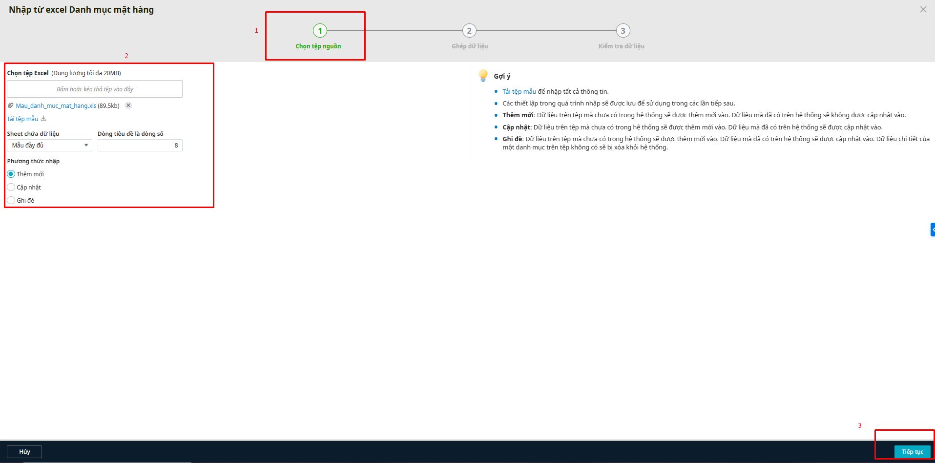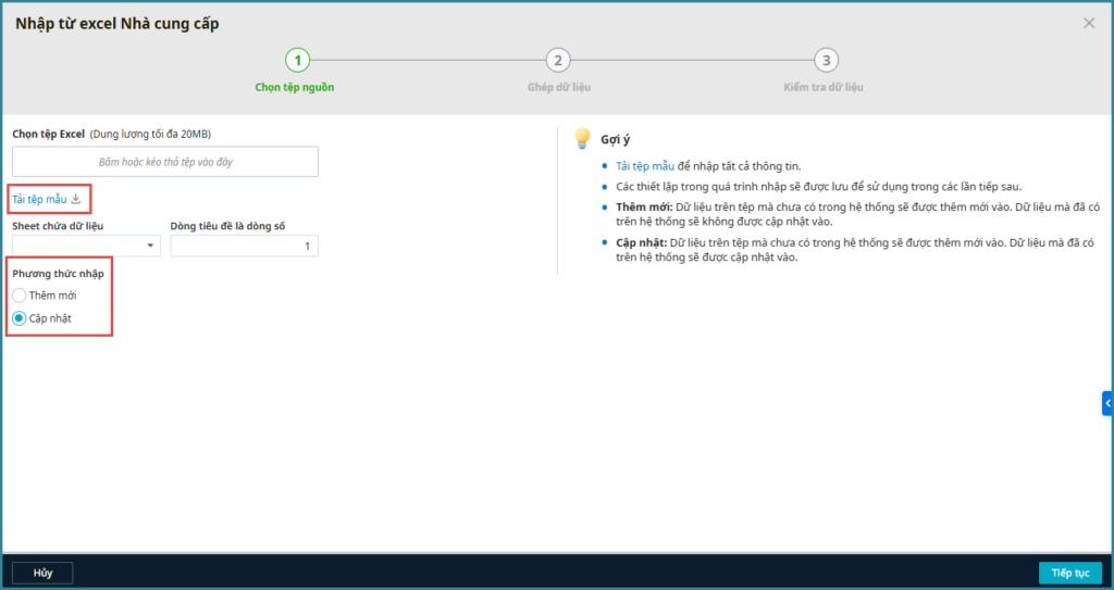 Bước 2: Chọn tệp nguồn: Chọn file excel chứa dữ liệu cần nhập khẩu, chọn Phương thức nhập.