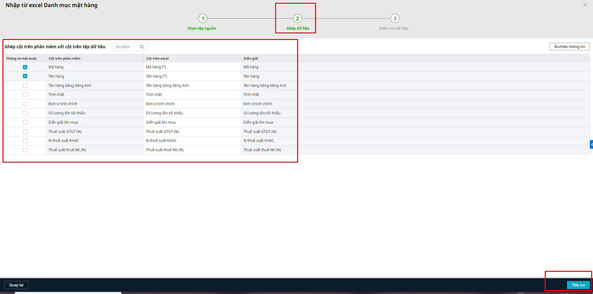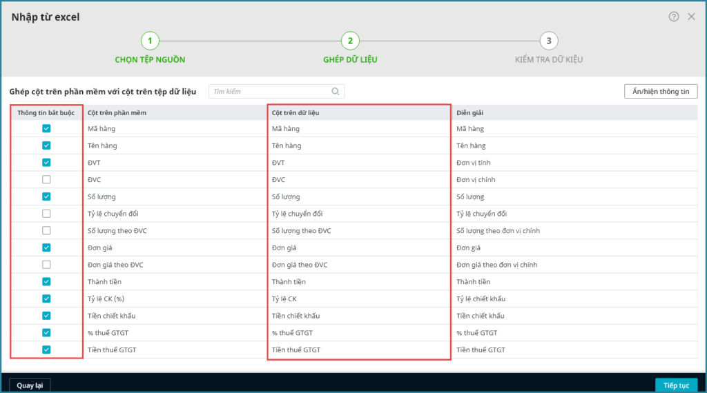 Bước 3: Ghép dữ liệu: Ghép cột dữ liệu trên phần mềm với cột dữ liệu trong file excel.