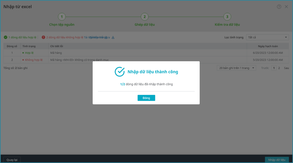 Bước 5: Nhấn Nhập dữ liệu: Chương trình hiển thị kết quả nhập khẩu.