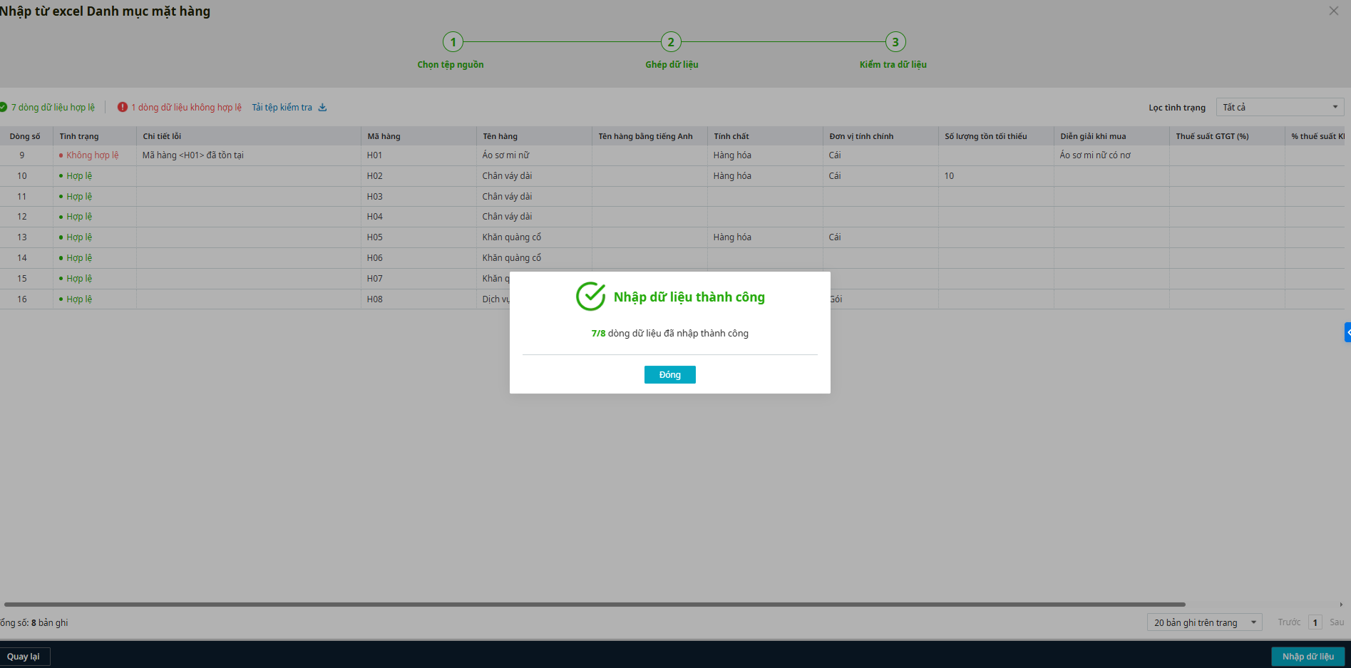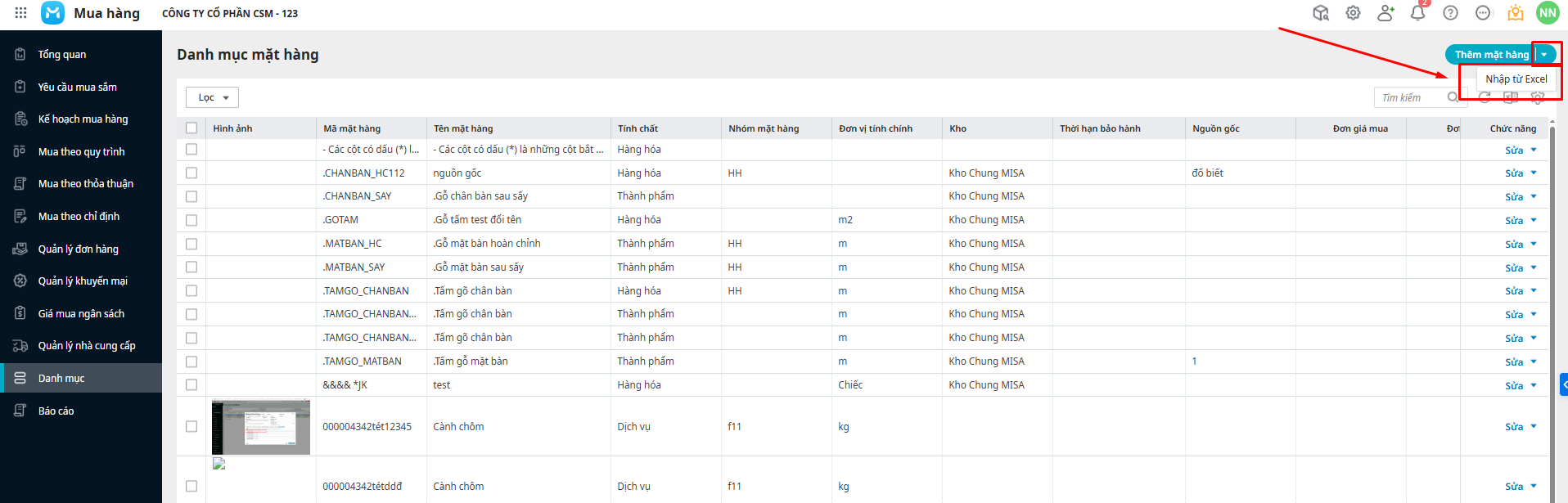 Ví dụ 1 : Nhập khẩu từ excel trên giao diện danh mục/mặt hàng (Danh mục Nhà cung cấp thực hiện thao tác tương tự).