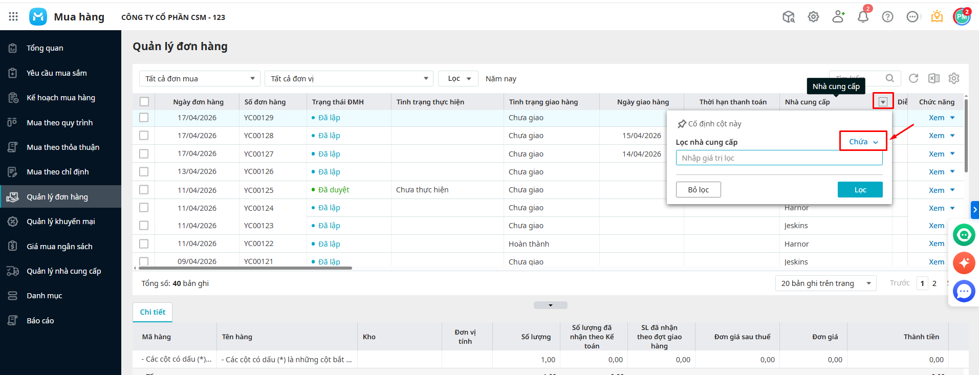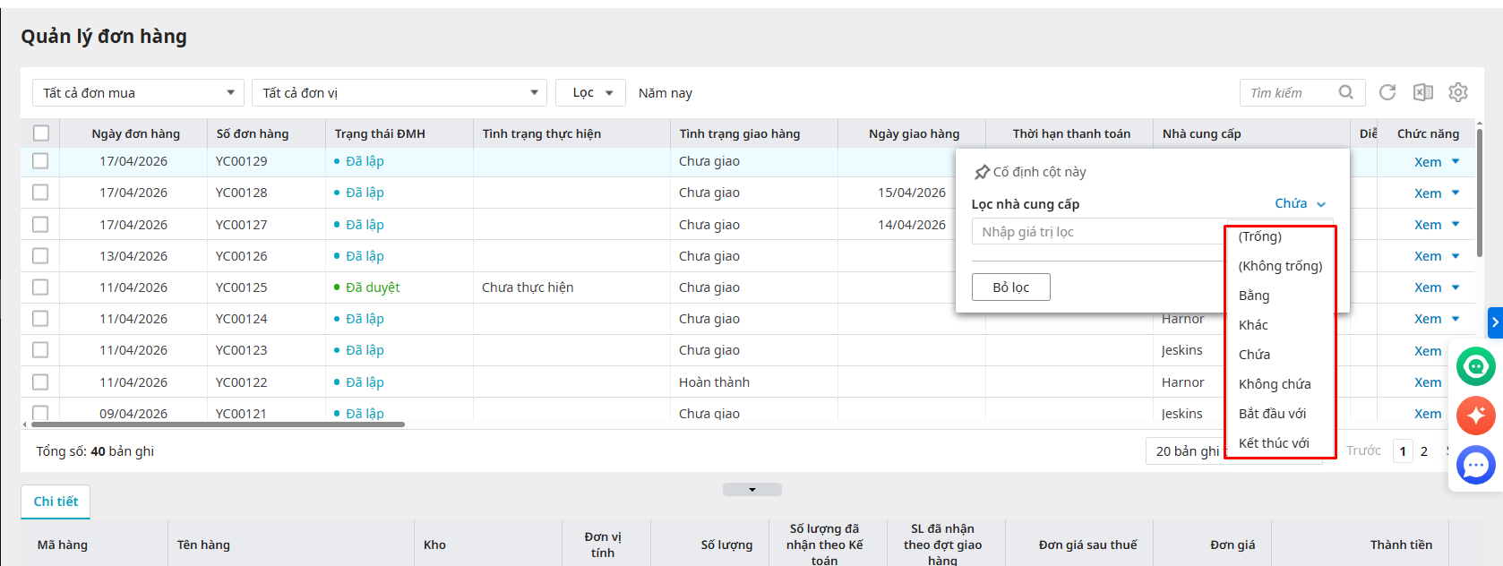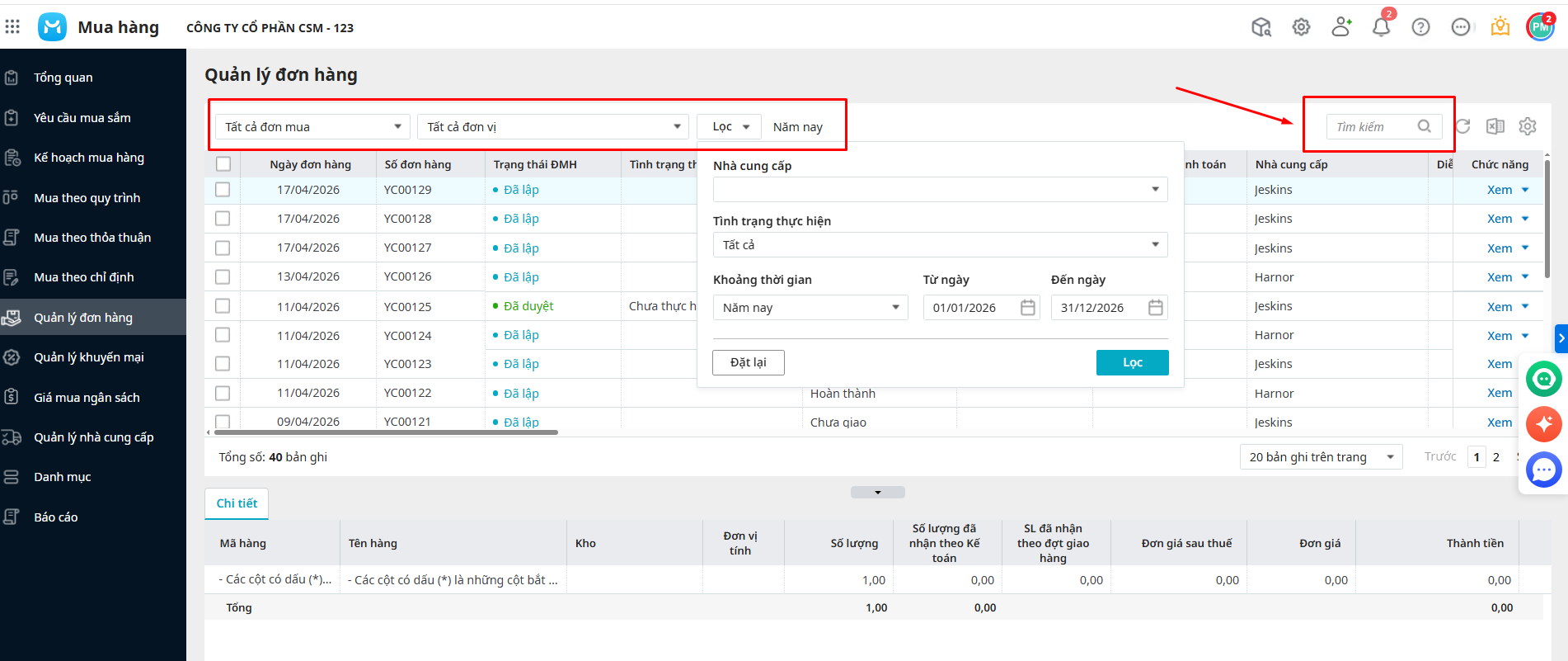 - Sử dụng bảng điều kiện lọc ở trên cùng để lọc theo đơn vị, thời gian và ô tìm kiếm để gõ tìm kiếm nhanh đơn hàng theo kí tự mã đơn hàng, tên nhà cung cấp, …