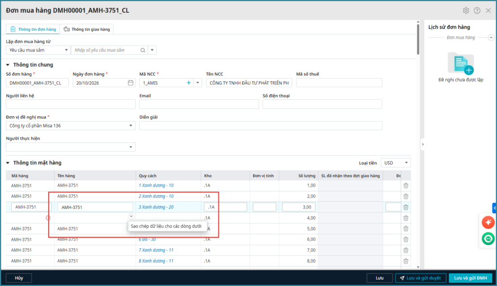 Bài viết này hướng dẫn chi tiết cách sử dụng tính năng Sao chép dữ liệu xuống các dòng dưới trên chứng từ Mua theo chỉ địnhTính năng này giúp nhân viên mua hàng nhập liệu nhanh chóng và chính xác, đặc biệt khi cần lập chứng từ cho nhiều mặt hàng có thông tin chung, qua đó tiết kiệm tối đa thời gian và công sức.