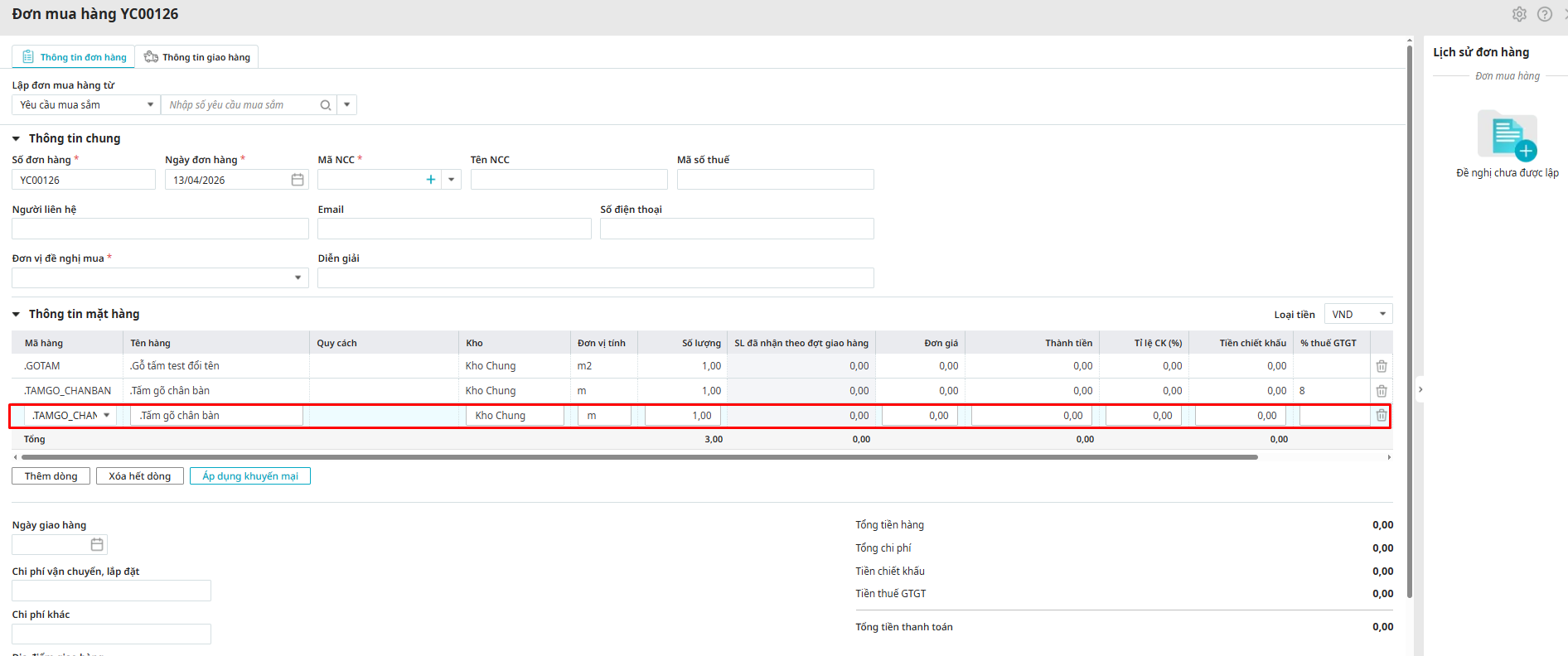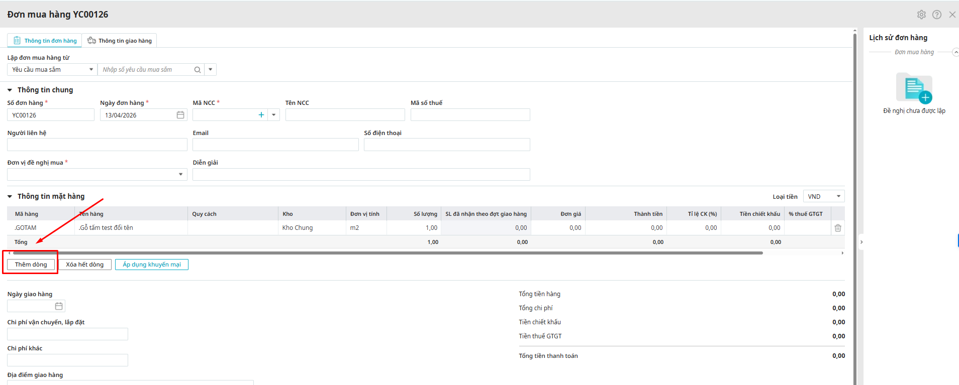 Bước 1: Trên giao diện Đơn mua hàng\ Chọn Thêm dòng.