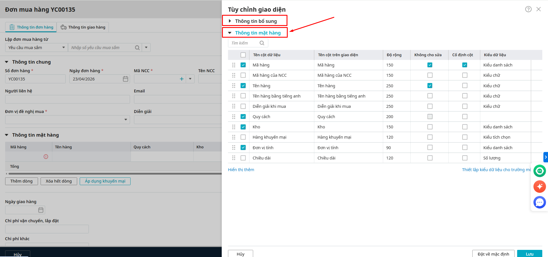 Bước 3: Tìm kiếm các trường thông tin đang bị bôi xám không điền/chọn được và kiểm tra có đang tích chọn vào cột Không cho sửa hay không?