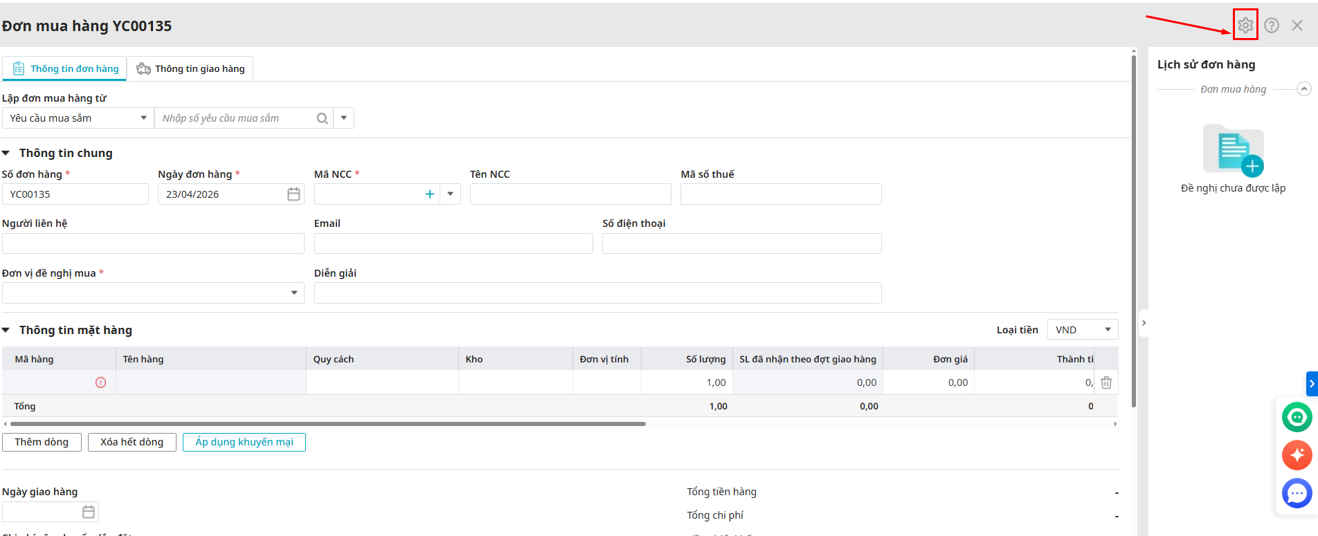 Bước 1: Trên chứng từ nhấn biểu tượng bánh răng góc phải trên cùng\ Chọn Tùy chỉnh giao diện.