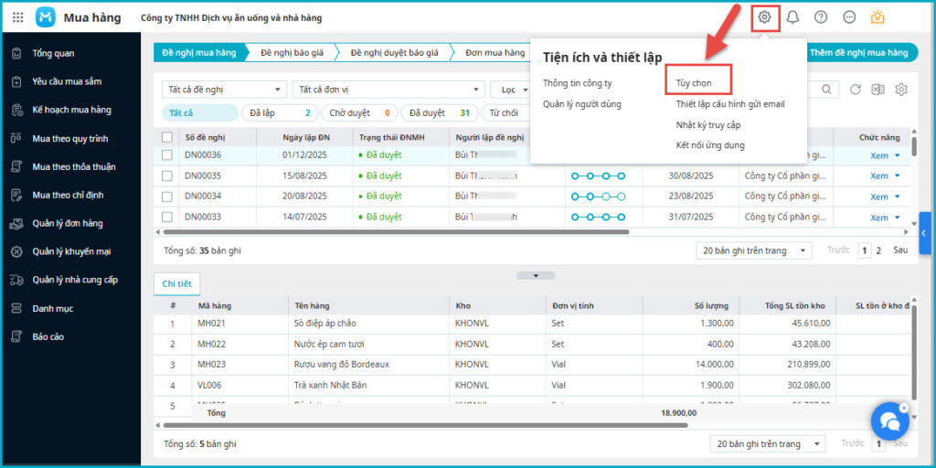 Tại tab Tuỳ chọn phê duyệt, người dùng sẽ thiết lập tuỳ chọn liên quan đến Mua hàng theo quy trình, Mua hàng theo thỏa thuận có hay không cần yêu cầu phê duyệt.3. Tùy chọn báo cáo, chứng từ