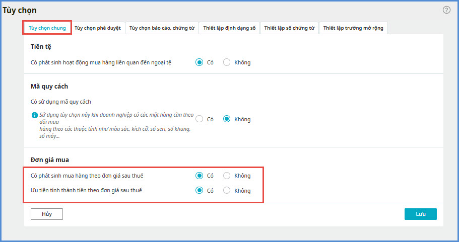 Tại tab Tuỳ chọn chung, người dùng sẽ thiết lập tuỳ chọn liên quan đến Tiền tệ, Mã quy cách, Đơn giá mua