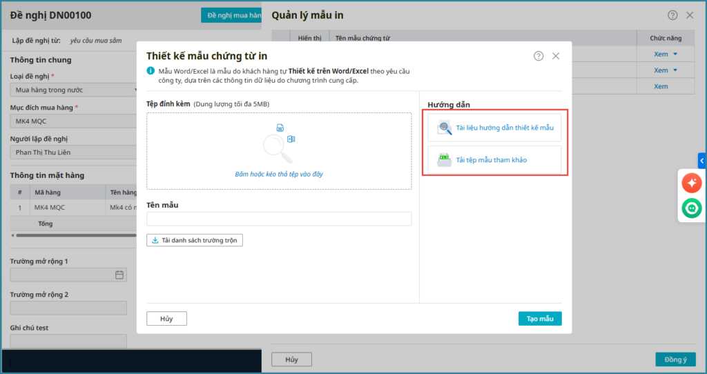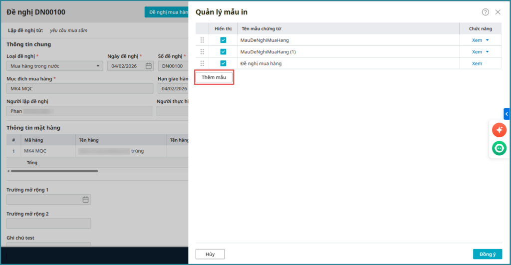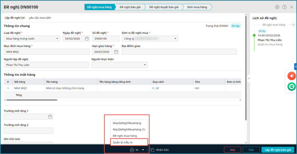 - Trên form lập Đề nghị mua hàng → chọn biểu tượng mũi tên In → nhấn Quản lý mẫu.