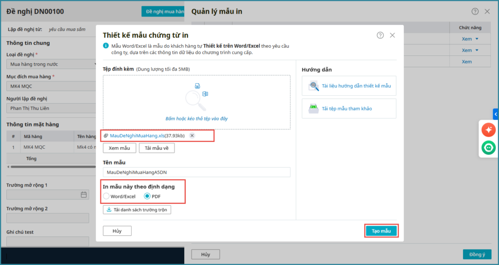 - Sau khi tải lên hoàn tất → chọn định dạng In→ nhấn Tạo mẫu.