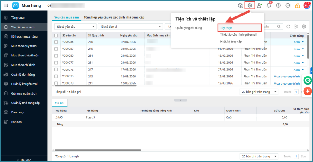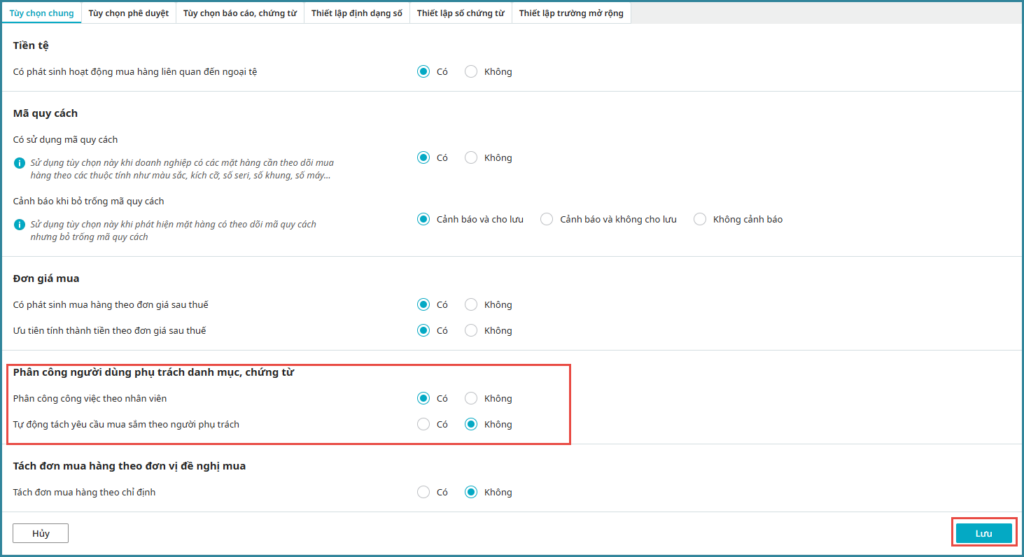 - Chọn Có/Không tự động tách yêu cầu mua sắm theo người phụ trách.