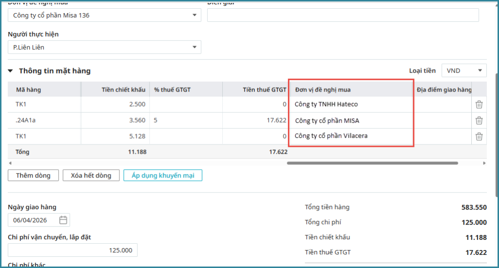 - Trường hợp tích chọn Có: phần mềm sẽ tách đơn mua theo đơn vị đề nghị mua để dễ dàng quản lý và gửi đúng đơn vị yêu cầu.