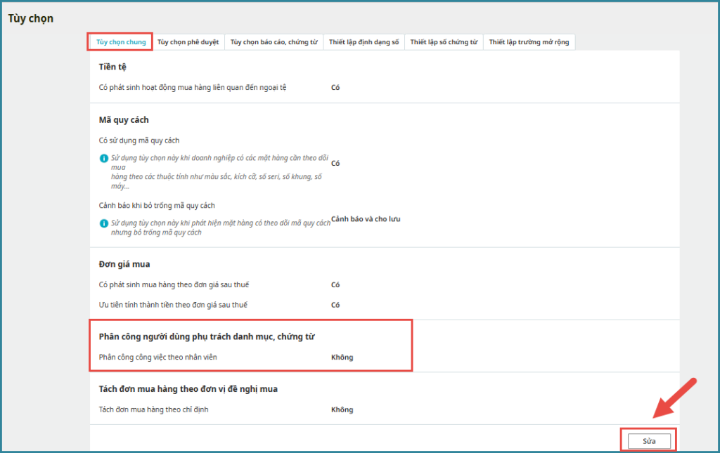 Bước 2: Tại Tùy chọn chung\ Nhấn Sửa để thiết lập.