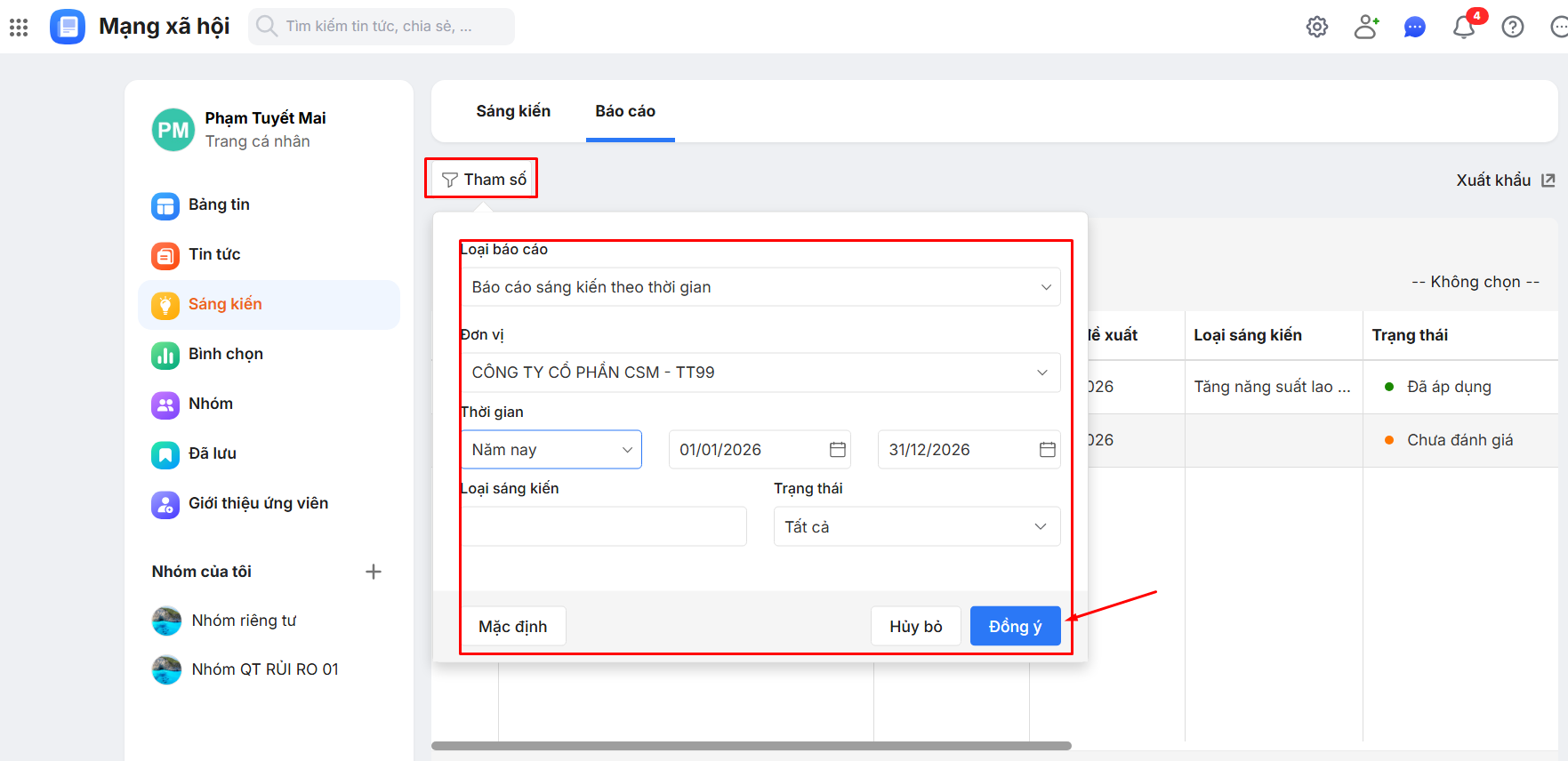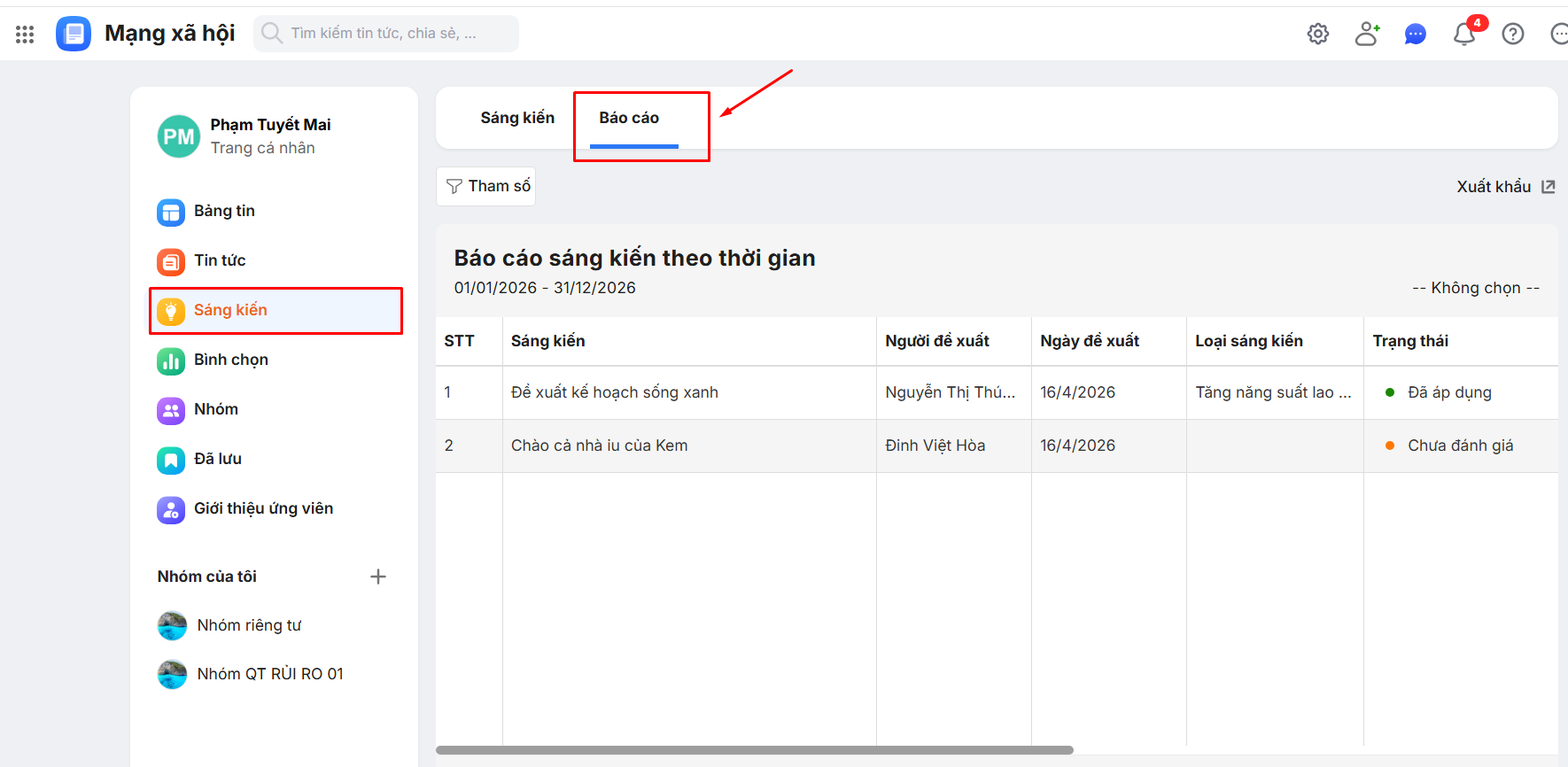 Bước 1: Trên giao diện AMIS Mạng xã hội\ Truy cập phân hệ Sáng kiến\ Chọn mục Báo cáo.