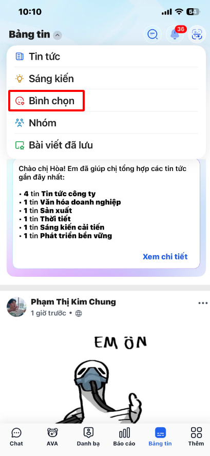 Bước 1: Trên giao diện Bảng tin, chọn Bình chọn.