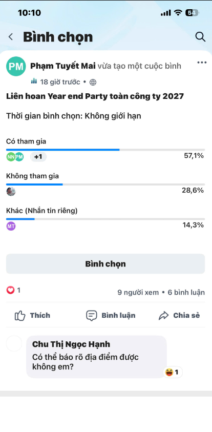 Bài viết hướng dẫn tính năng tạo cuộc bình chọn trên mạng xã hội doanh nghiệp. Tính năng này cho phép người dùng khảo sát nhanh ý kiến của đồng nghiệp về một chủ đề cụ thể, giúp thu thập kết quả bình chọn một cách nhanh chóng, thuận tiện mà không cần hỏi từng người.