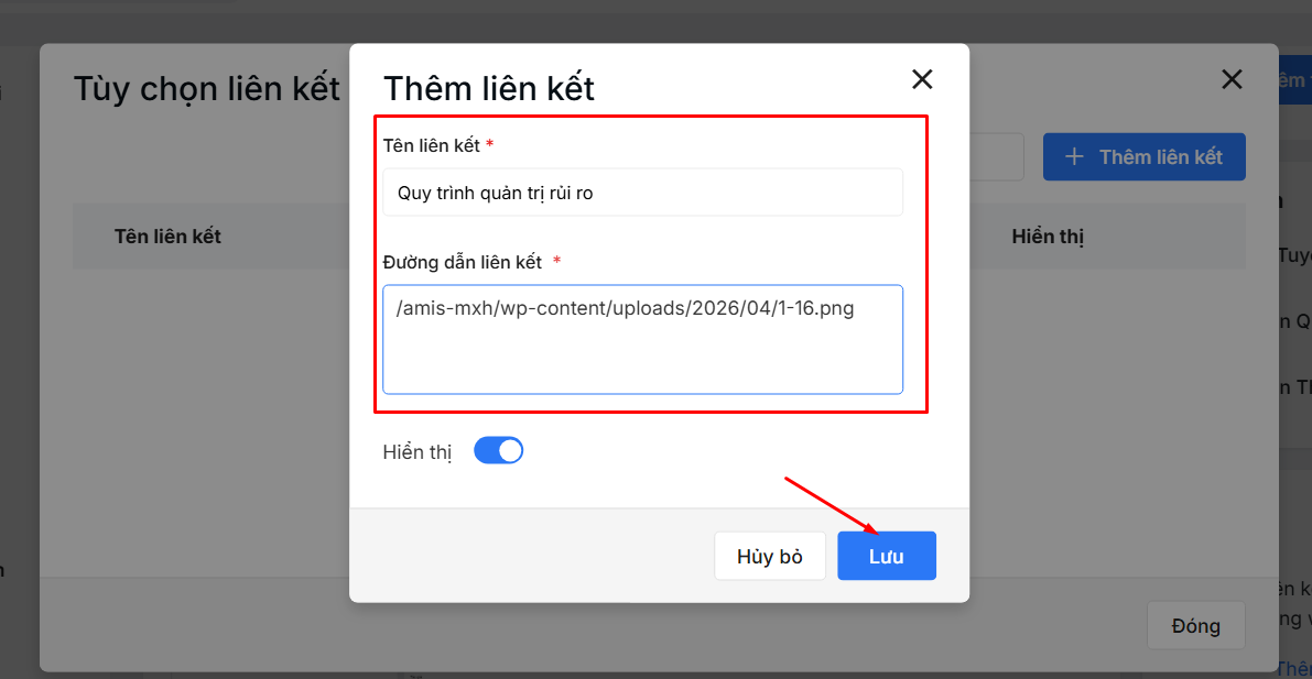 Bước 2: Thêm liên kết và link liên kết\ Nhấn Lưu.