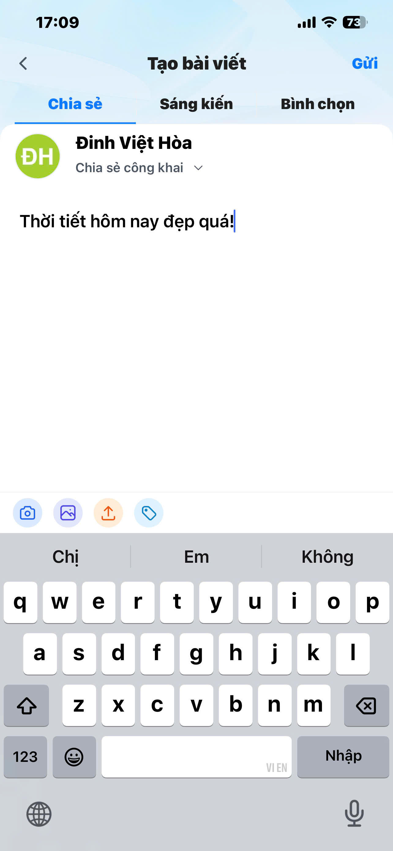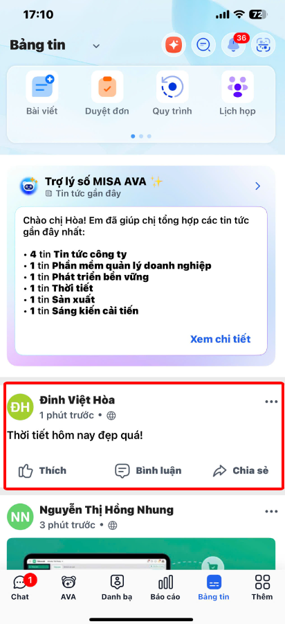 Bước 3: Chạm Gửi. Bài viết sẽ hiển thị ngoài Bảng tin.