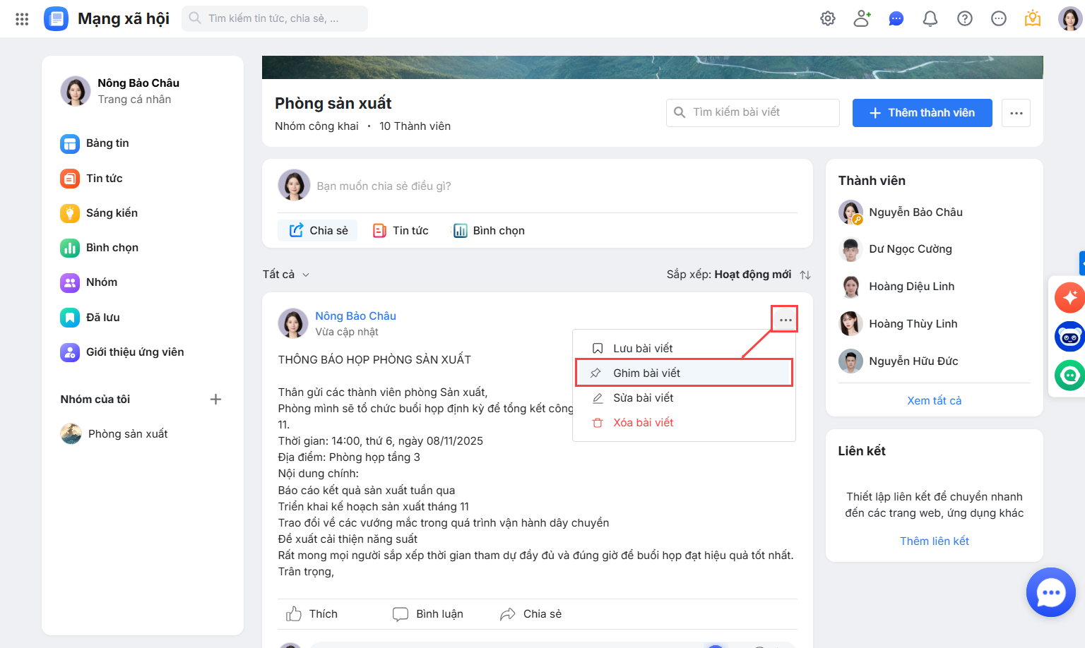 Tính năng Ghim bài viết trong nhóm cho phép Quản trị viên cố định các thông báo, nội dung quan trọng lên đầu trang của nhóm. Điều này giúp thành viên dễ dàng tiếp cận những thông tin cần chú ý, tránh bỏ lỡ các cập nhật quan trọng.