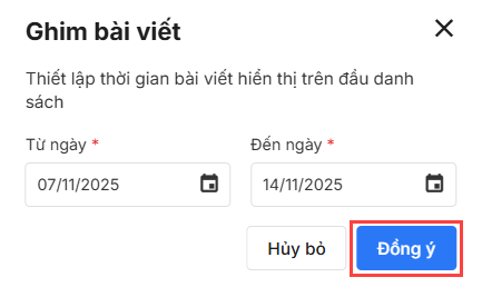 2. Trên pop-up hiển thị, anh/chị thiết lập khoảng thời gian ghim bài tại mục Từ ngày và Đến ngày. Nhấn Đồng ý để xác nhận.