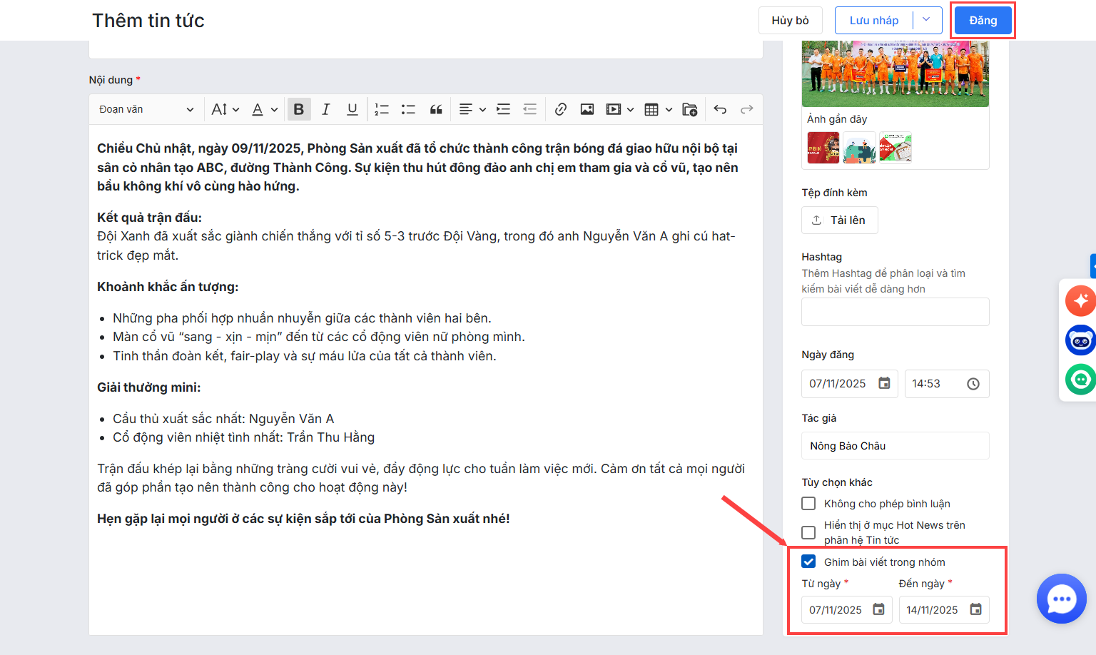 1. Ghim bài viết khi đăng tin tức mới