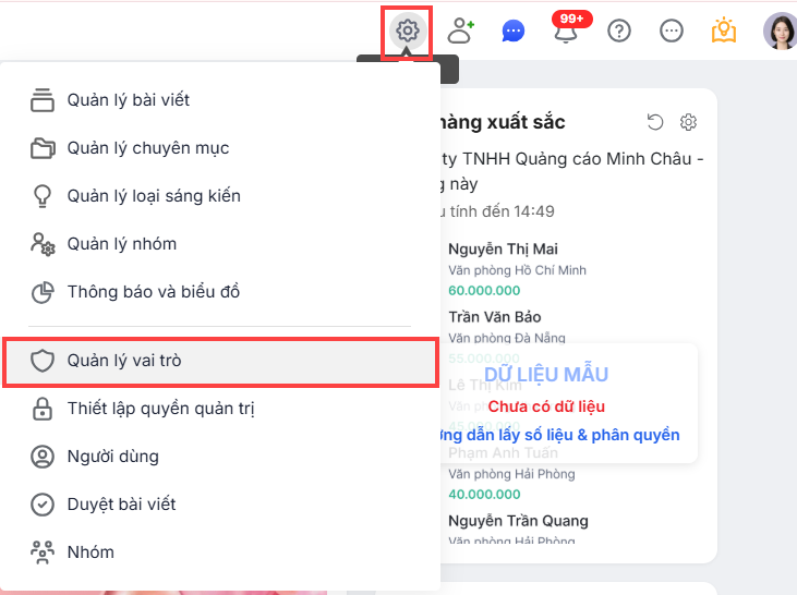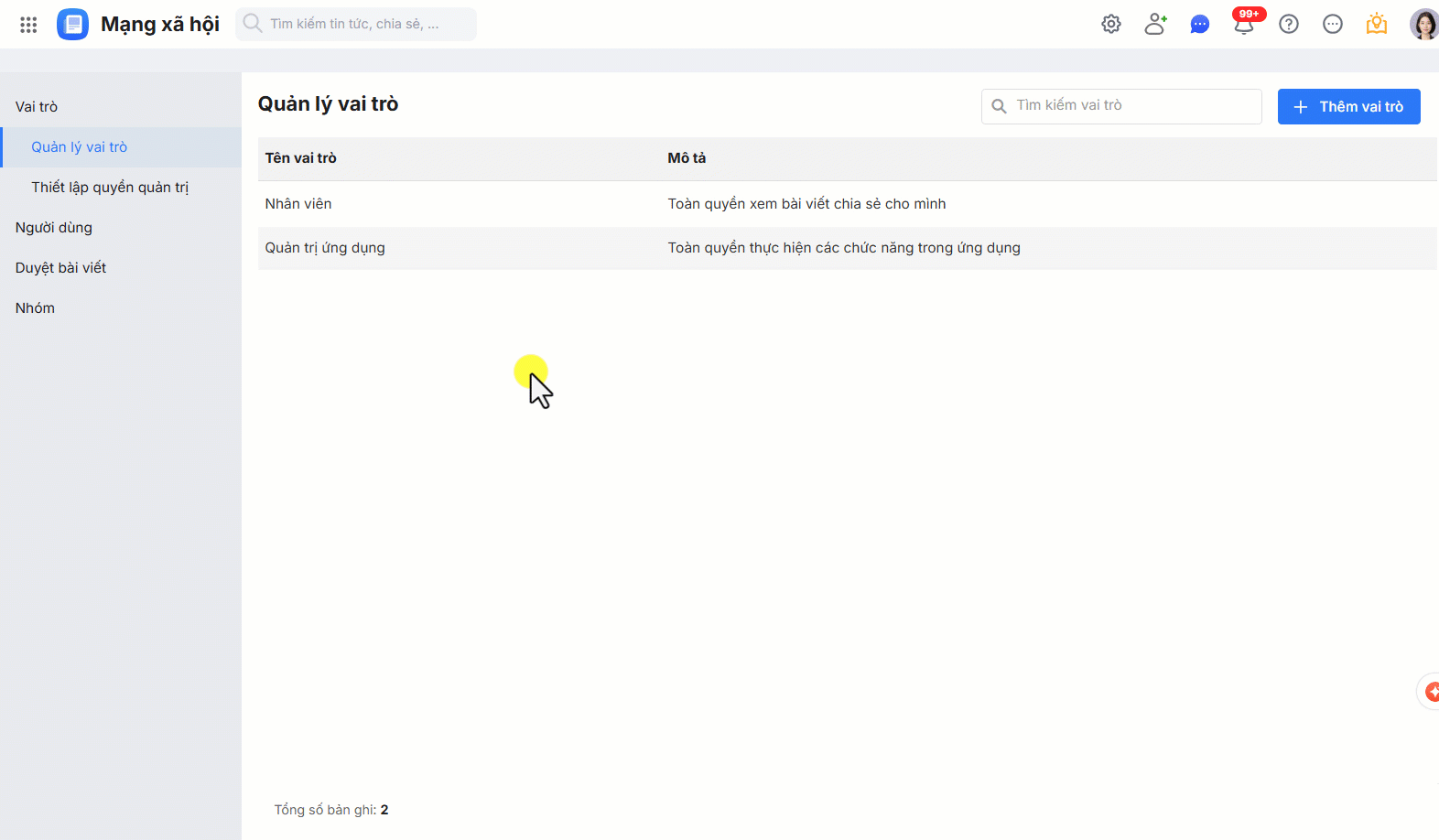 1. Trên giao diện ứng dụng AMIS MXH, nhấn vào icon Bánh răng. Chọn Vai trò, hệ thống sẽ hiển thị danh sách vai trò.