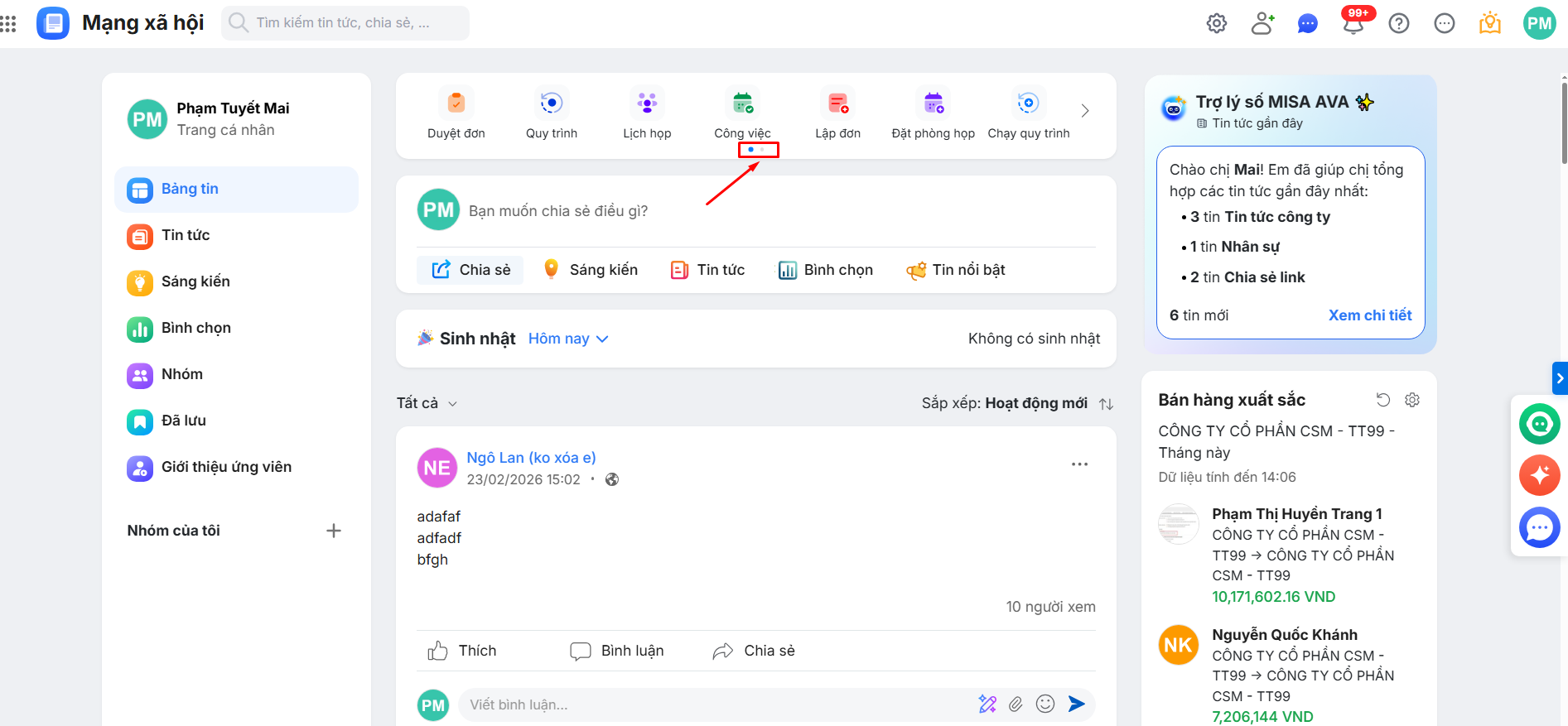 Bước 1: Mở ứng dụng AMIS Mạng xã hội\ Tại góc trên cùng của Bảng tin hiển thị danh sách các lối tắt hiển thị theo thiết lập cá nhân.