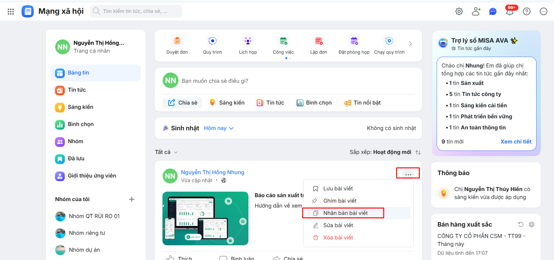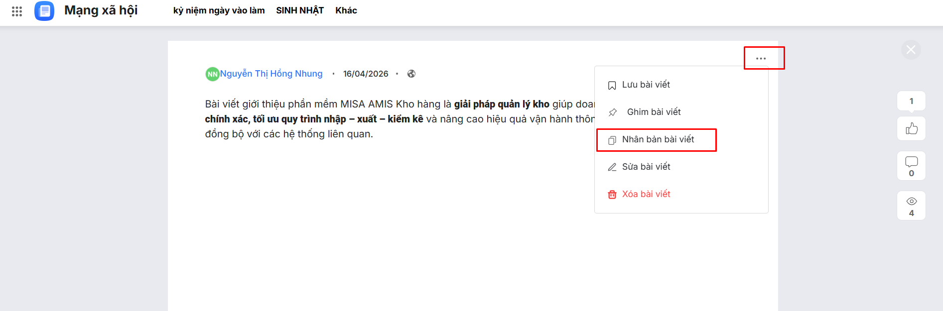 - Nhân bản bài đăng hiển thị trên phân hệ Bảng tin/Tin tức: Vào bài viết cần nhân bản\ Nhấn vào biểu tượng dấu ba chấm\ Chọn Nhân bản bài viết.