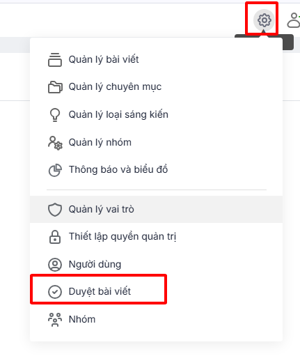 Bước 1: Nhấn vào biểu tượng Thiết lập trên thanh công cụ. Chọn Duyệt bài viết để vào giao diện Phê duyệt bài viết