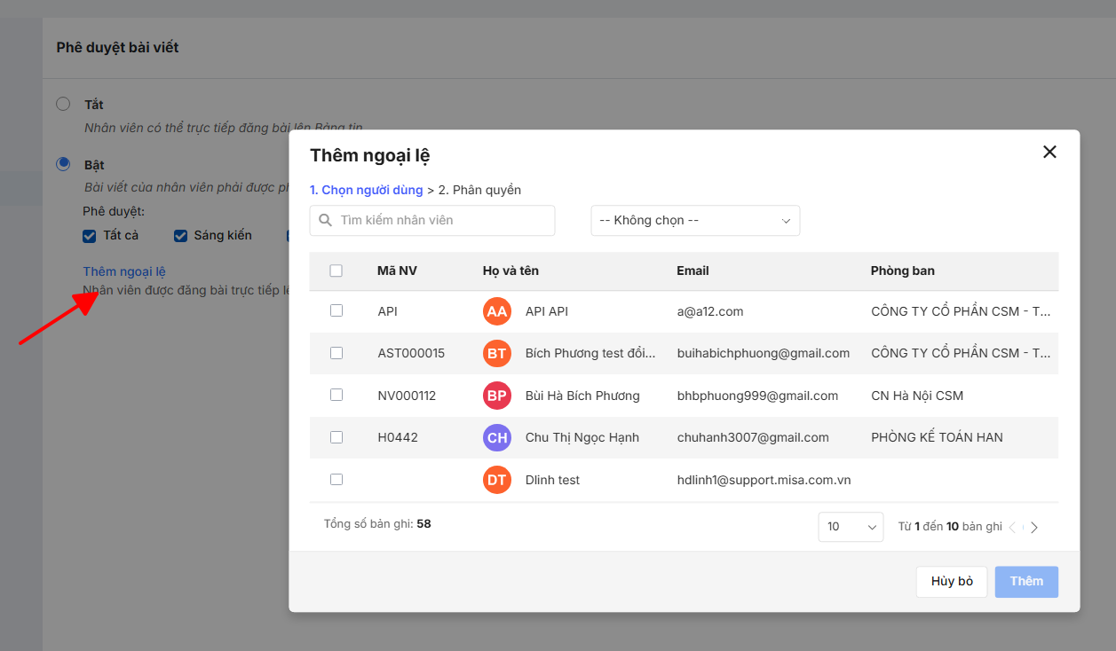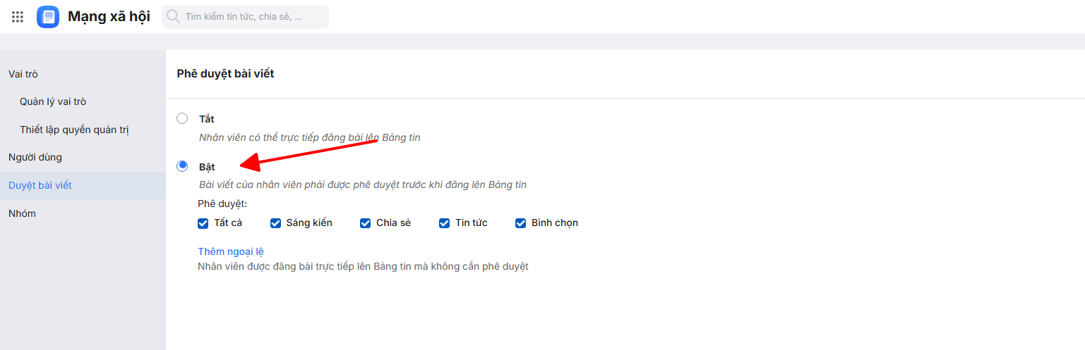 Bước 3: Trường hợp muốn cho phép một số nhân viên được đăng bài trực tiếp mà không cần qua phê duyệt, người dùng chọn Thêm ngoại lệ.