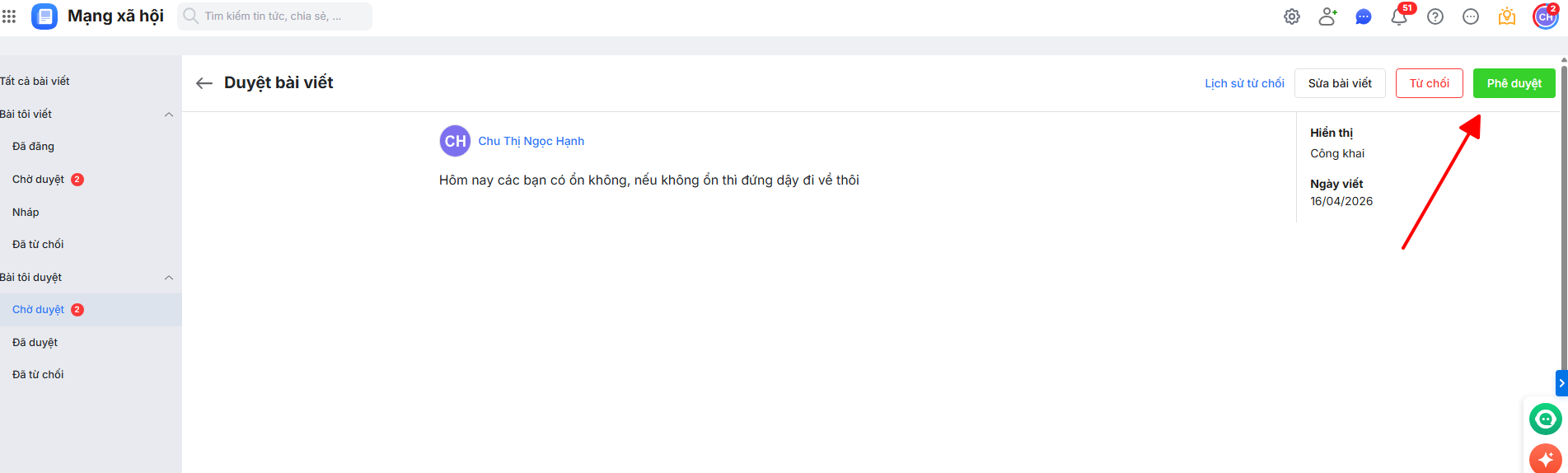 Hướng dẫn về tính năng phê duyệt bài viết trước khi đăng lên bảng tin nhằm kiểm soát thông tin, đảm bảo nội dung phù hợp với văn hóa doanh nghiệp và tránh các bài viết không mong muốn.