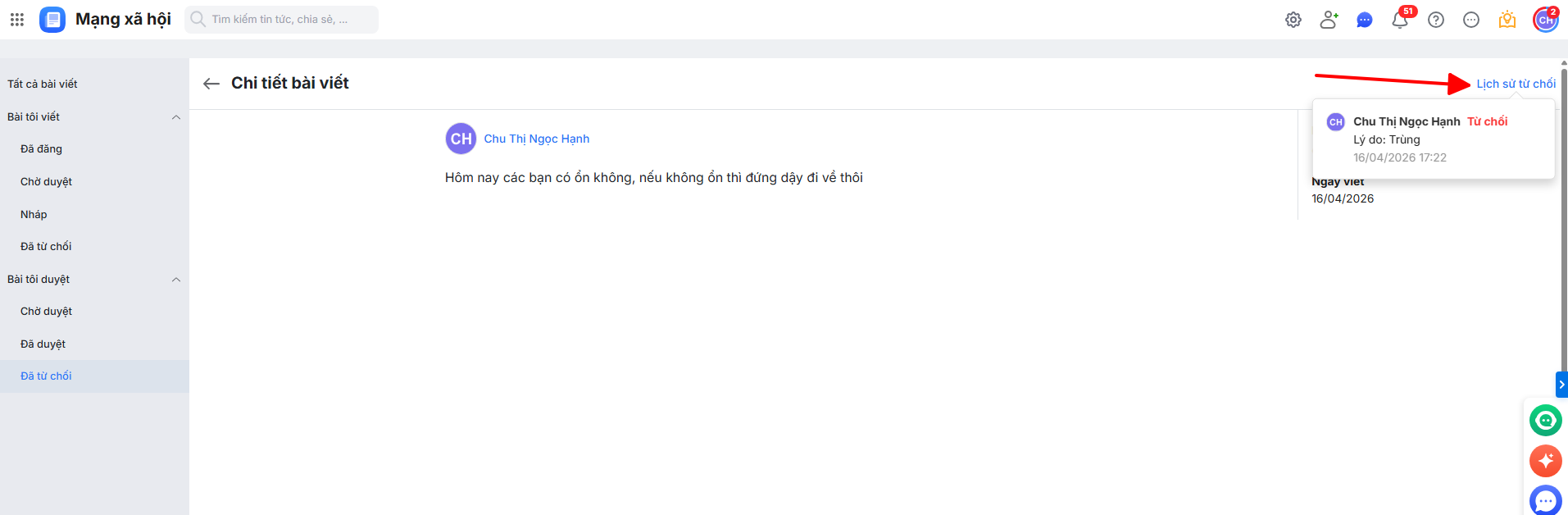 - Với các bài viết bị từ chối, có thể xem lý do từ chối trên giao diện Quản lý bài viết “Đã từ chối”