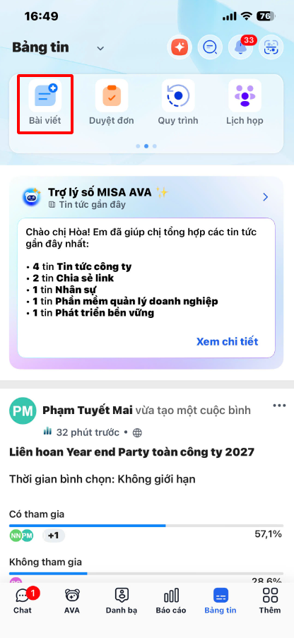 Bước 1: Trên giao diện Bảng tin, chạm thêm mới Bài viết.