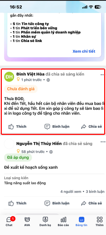 Ngoài ra, có thể chạm vào mục Bảng tin, chọn Sáng kiến để xem tất cả các bài bình chọn mà người dùng được phép nhìn thấy.